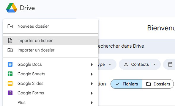 - Cliquez sur + Nouveau > Importer un fichier pour déposer votre fichier.