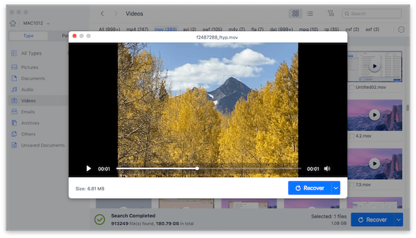 Dopo aver completato la scansione, vai su Tipo > Video per individuare i video Ring eliminati che vuoi recuperare. Puoi visualizzarli in anteprima per assicurarti che siano quelli giusti.![recover ring videos 02]()
