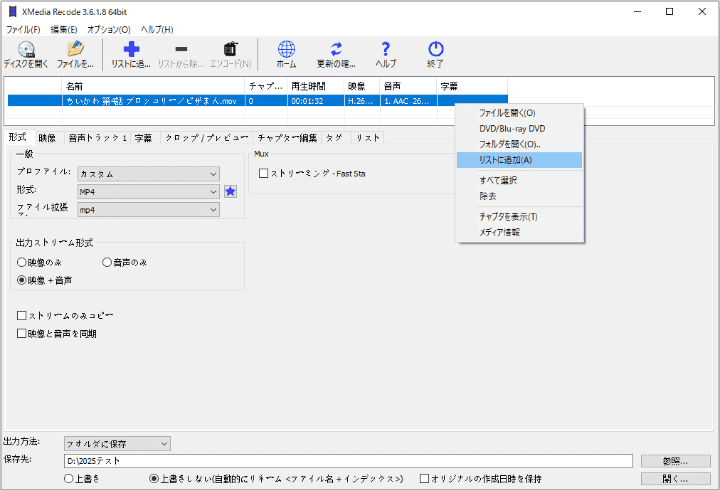 - 追加したMOVファイルを右クリックし、「リストに追加」をクリックします。