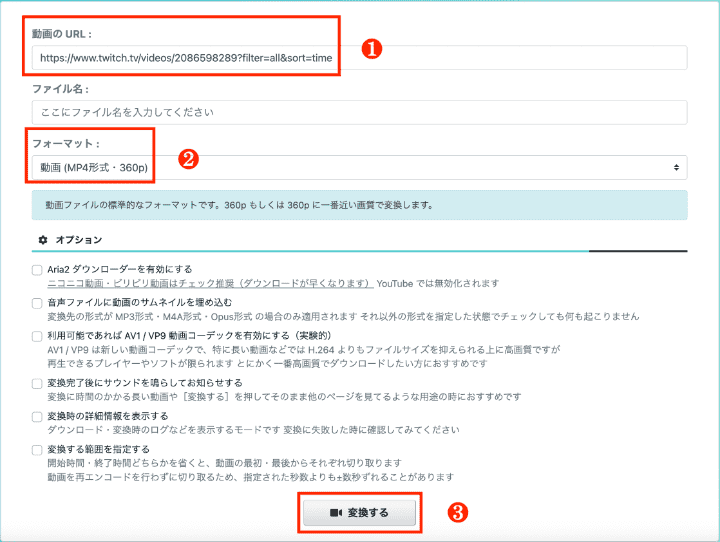 - Twitch動画をMP4、MP3、AVI、WOVなど600以上の形式に変換する