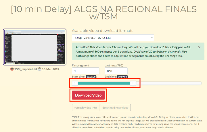 - デフォルトで最低画質が選択されています。高画質のTwitch動画をダウンロードしたい場合は手動で選択してください。そしてダウンロードする時間を設定し、「Download Video」をクリックします。