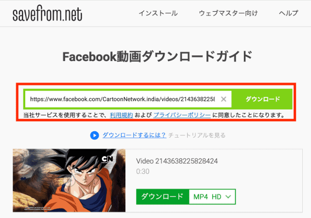 - https://ja.savefrom.net/9-how-to-download-facebook-video-20.htmlにアクセスします。