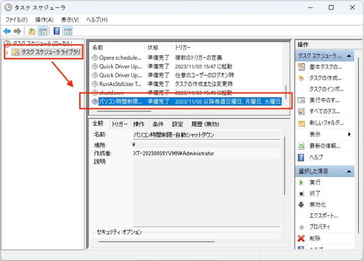 11. これでタスク作成完了です。左のカラムで「タスク スケジューラ ライブラリ」をクリックして、中のカラムでそのタスクを確認できます。