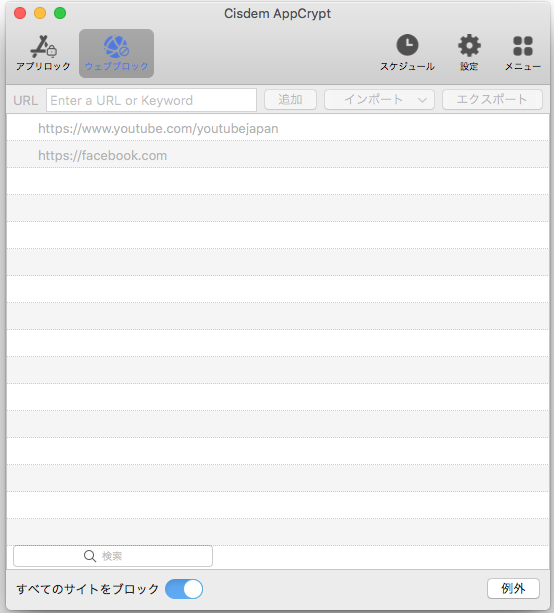 ネットで調べものが必要で、Chromeなどのブラウザの使用を制限できない場合は、ウェブサイトをブロックする機能でYouTubeなど気が散るサイトをブロックしましょう。「インポート」をクリックしてTXTファイルで一度に複数のURLを追加でき、カテゴリ別に動画サイトやゲームサイトを一気に追加することができます。また、キーワードでサイトをブロックできます。