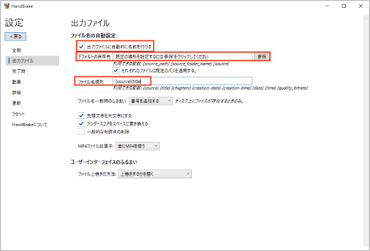 4. 「設定」>「出力ファイル」タブで「出力ファイルに自動的に名前を付ける」にチェックを入れて、「ファイル名規則」を設定します。例えばここでファイル名規則を「{source}{title}」に設定します。デフォルトの保存先も設定できます。