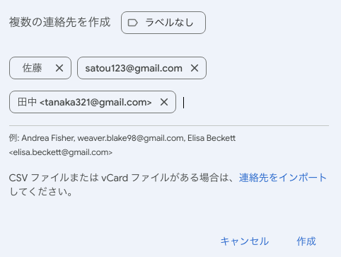 4. Googleコンタクトにインポートしたい名前、メールアドレスまたはこの両者を手動で追加します。