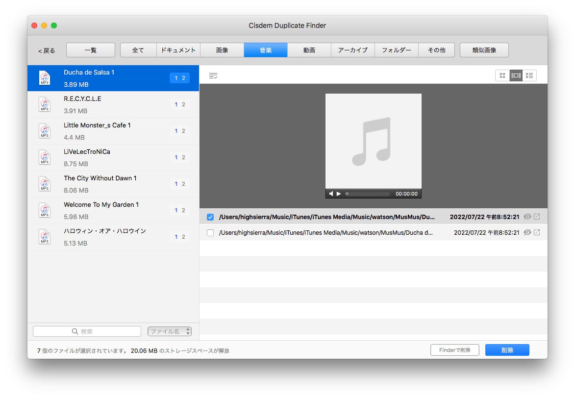 3. スキャンが終了すると、「音楽」タブの下に、すべての重複した楽曲が表示されます。さらに、下記のような場合にもiTunesのプレイリストの重複を見つけることができます。