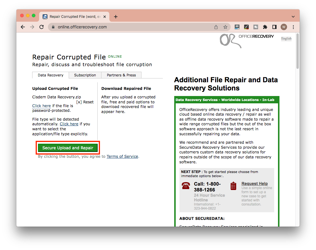アーカイブ修復ツールのほか、RARアーカイブを修復できるオンラインサービスもあります。次はhttps://online.officerecovery.com/jp/というサイトでRARアーカイブを修復する手順です。
