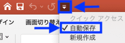 表示されない場合は、右の下向き矢印をクリックして、「自動保存」をクリックしてチェックを入れればクイックアクセスバーに表示されます。