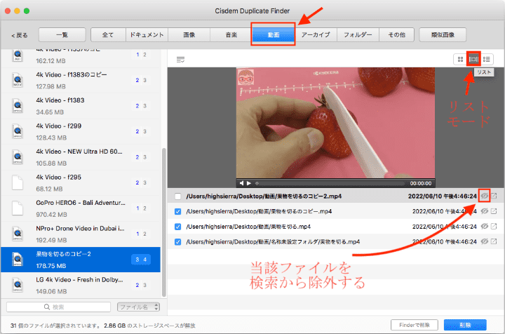 5. Mac版は検出した重複動画をソフト内で再生して確認できる