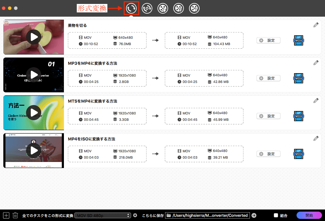 Cisdem Video ConverterでYouTubeをダウンロードする場合、MP4、Webm、3GP、M4Aなどの形式が選択できますが、MOVやM4Vなどの形式がほしい場合は、やはり形式変換が必要です。この部分では、ダウンロードしたYouTube動画/曲をiTunesに最適な形式に変換する方法を紹介します。また、動画編集を行いたい場合も、このステップで簡単に編集できます。