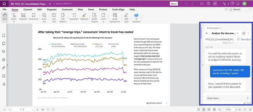 For its AI function. Foxit AI integrates ChatGPT into its system to increase productivity when editing PDFs. You can use AI to generate summaries of the PDF file, proofread and rewrite the PDF. Additionally, you can chat with the PDF on the content related information.