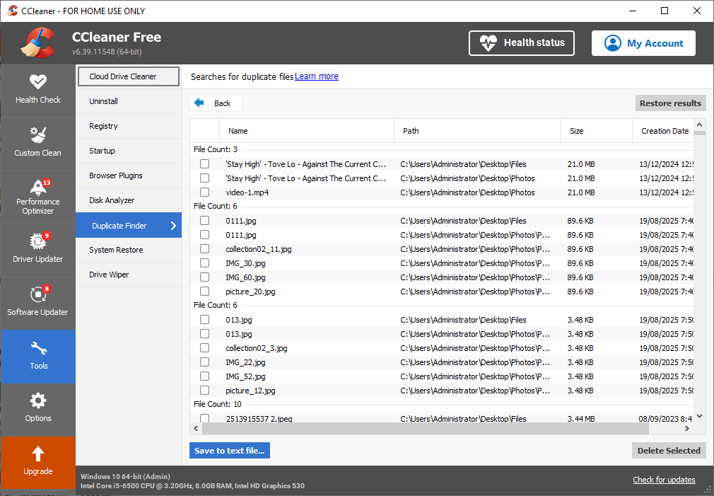 CCleaner provides free and paid version, and the free version lets you remove duplicate files truly for free.
