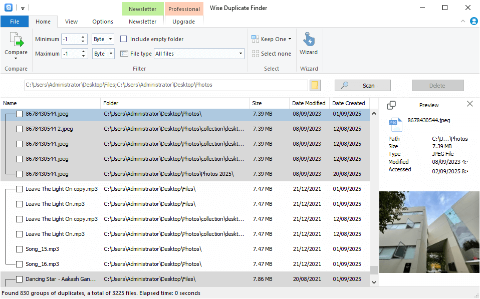 Wise Duplicate Finder has a free version and a paid one. The free version can quickly scan for duplicates but don’t help much in removing them.