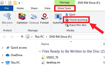 - Once done, click “Drive Tools” > Finishing burning” to activate the “Burn to Disc” window.