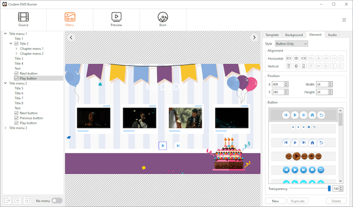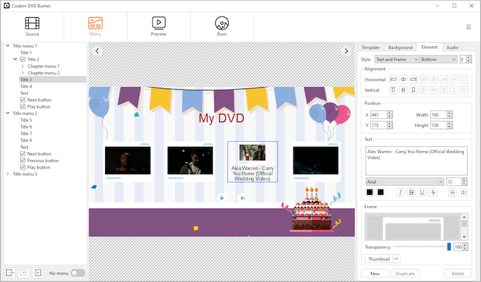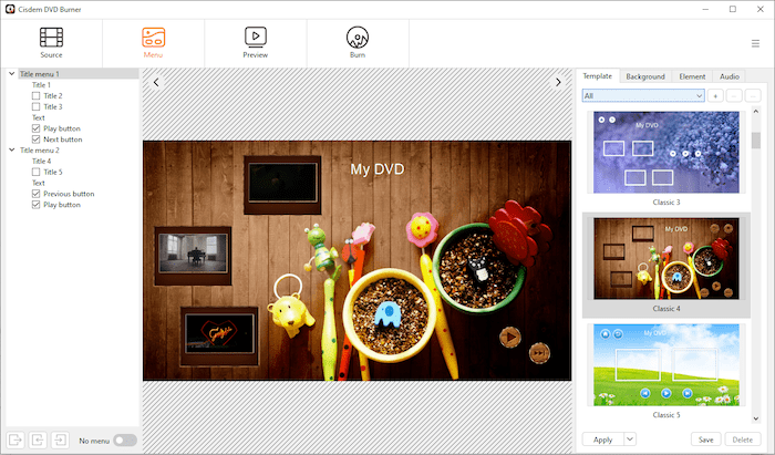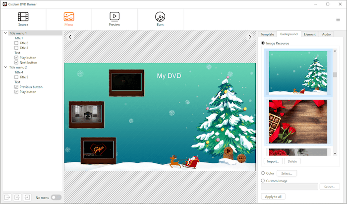 If you want to customize the DVD menu, you can just highlight the target Title menu/Title/Chapter Menu/Chapter, and then choose proper template, background, elements and audios on the right side.