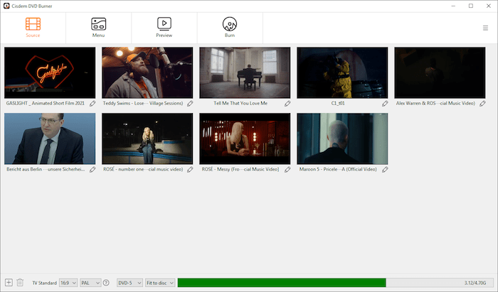 On the bottom of main interface you will see a progress bar which apprises you about the storage, you can choose the corresponding DVD type: DVD-5 or DVD-9. The difference between them is the storage, the former one can hold up as much as 4.7 gigabytes whereas the latter one can store data of up to 8.5 gigabytes. Also you can choose the TV Standard: 16:9 PAL/NTSC or 4:3 PAL/NTSC and bitrate: Fit to disc, High quality and Standard, we suggest you to select Fit to disc, so that Cisdem DVD Burner will provide you with an optimal solution.