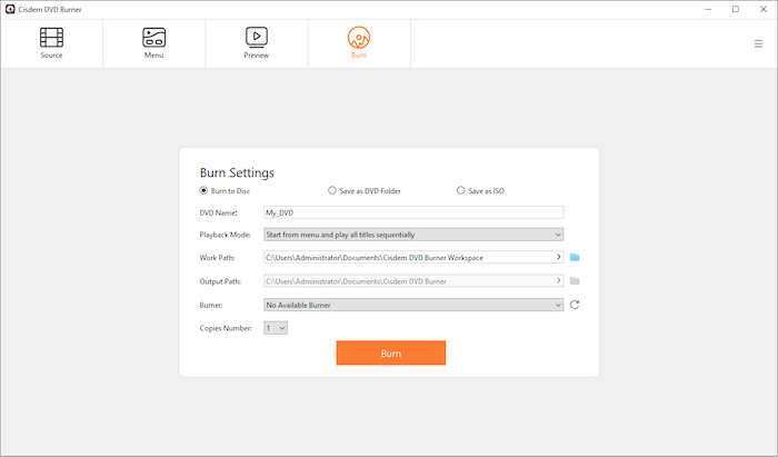 5. Burner: It displays the burners that Cisdem detects, and you can choose a proper burner before clicking the Burn button.