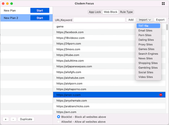 , choose Blocklist or Allowlist according to your needs, and then add the websites as follows: