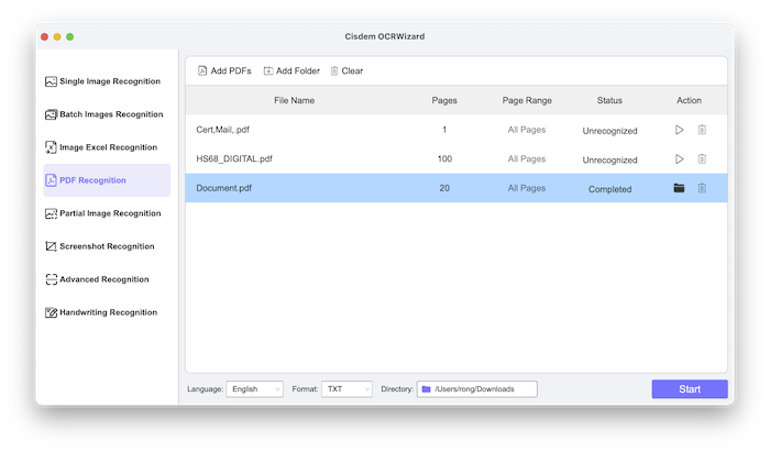 In addition to images, Cisdem OCR Wizard also allows you to extract texts from scanned PDFs/standard PDFs and save as TXT, DOCX and RTF files. If you want to convert a PDF file, you can just navigate to the PDF Recognition.