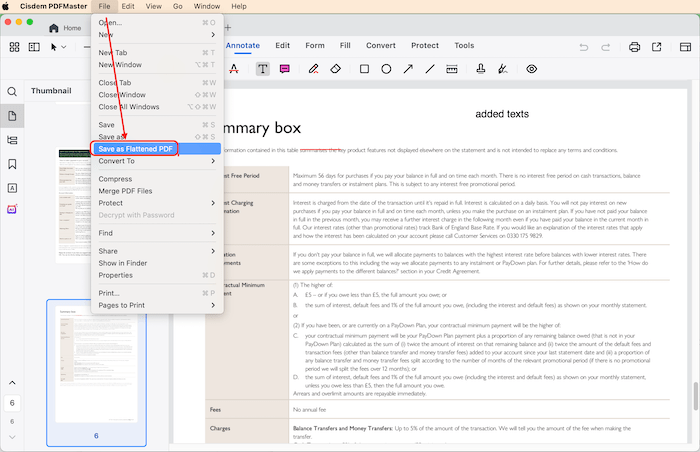 Open the PDF file with Cisdem PDFMaster, click File> Save as Flattened PDF on the top menu bar after finishing the edits. It will generate a flattened PDF and pops up a window to ask you to select a location to save the genrated flattened PDF.