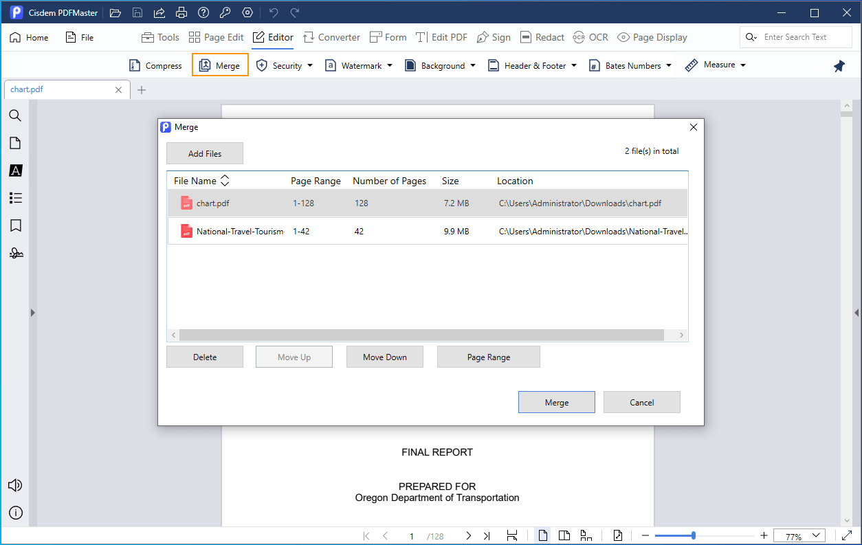 You can use this tool to merge the currently opend PDF and another PDF files. You can adjust the order of those PDF files by clicking "Move Up" or "Move Down", moreover, you can highlight a PDF file and select the page range that you want to merge by clicking "Page Range".