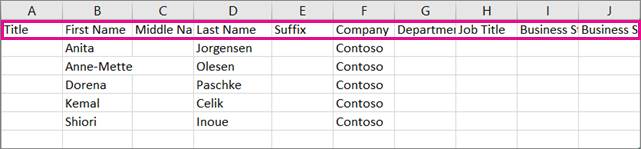 3. Add column headings for the contact information, for example, name, phone, birthday and email address.