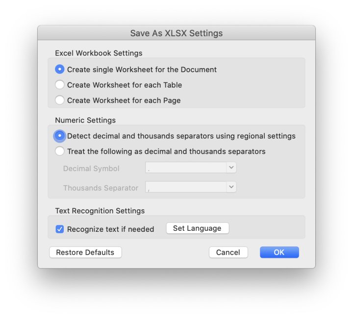 Besides Excel, more output formats are supported, like Word, PowerPoint, Images, iWork (Pages, Keynote and Numbers) and more.