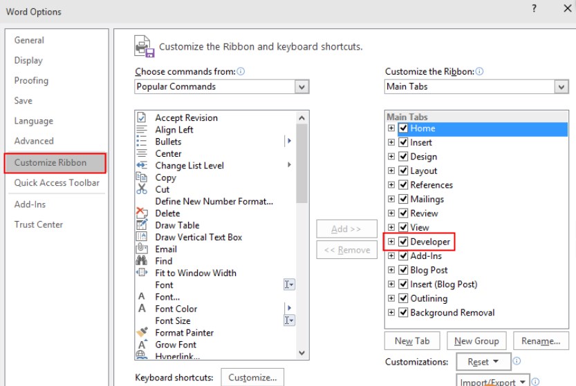 - In the pop up window, click Customize Ribbon and tick the box next to Developer on the right.