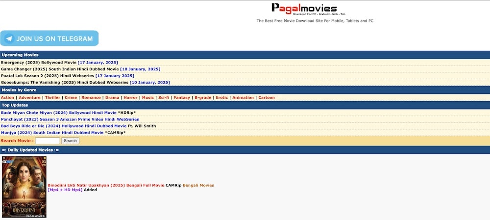 PagalMovies is another Hindi movie download website similar to Filmywap. It lets you download the latest Bollywood and Hollywood movies with Hindi dubbed in MP4 format. You can navigate through the full movies menu or conduct a search to find your desired movies.