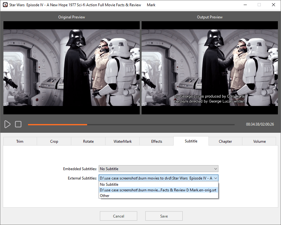 - Subtitle: A New Hope didn't come with subtitles, so I downloaded an English .srt file from a subtitle website and embedded it via Cisdem DVD Burner.