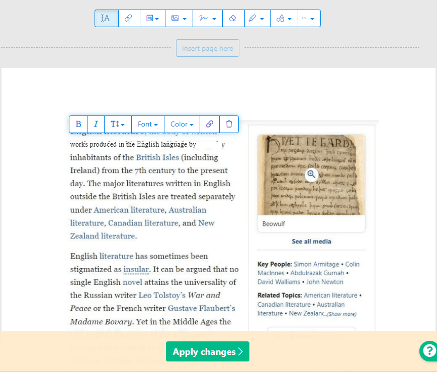 - In the editing page, you can edit the PDF at your discretion. Once done, click Apply changes > Download.