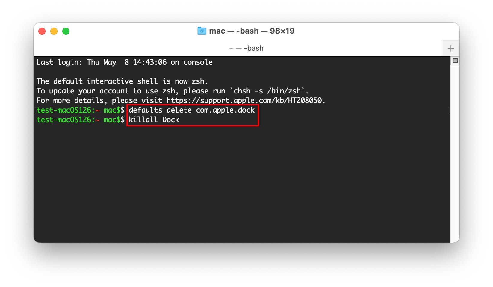 - Type “killall Dock” and hit Enter again to restore it to factory settings.