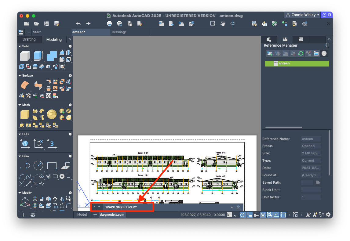 - Go to the command line box and enter DRAWINGRECOVERY, then press Enter.