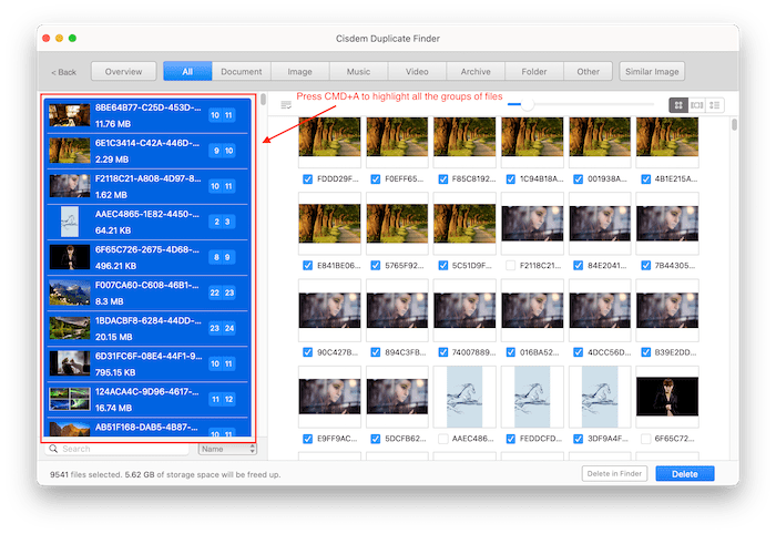 Cisdem list all the files by group, so that you can only view a group of files at once by default. However, you can also view all the files at once if you want to. Just press CMD+A to highlight all the groups of files, and then you can view all the files at once on the right side.