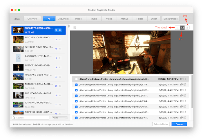 Cisdem Duplicate Finder has 3 modes for you to view files, the default view mode is Thumbnail. If you want to view the file’s path, you can navigate to List or Info mode.
