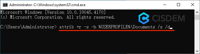 - Type this command: attrib +r -s -h %USERPROFILE%\Documents /s /d and press Enter.